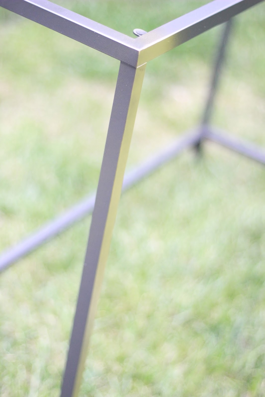 So, yesterday, my hubby was kind enough to help me spray these pieces with Rust-Oleum Gold Metallic Spray Paint. Both the desk and bookcase were sprayed with about 2 and a half cans total. That stuff definitely goes faster than you think! No primer needed on these pieces!